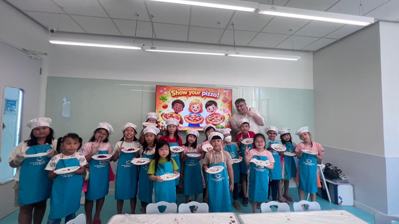 - Siswa belajar kosakata baru dalam Bahasa Inggris dan Mandarin saat mempersiapkan pizza.