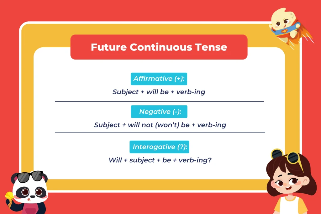 Untuk membuat kalimat dalam future continuous tense, kita menggunakan rumus berikut: